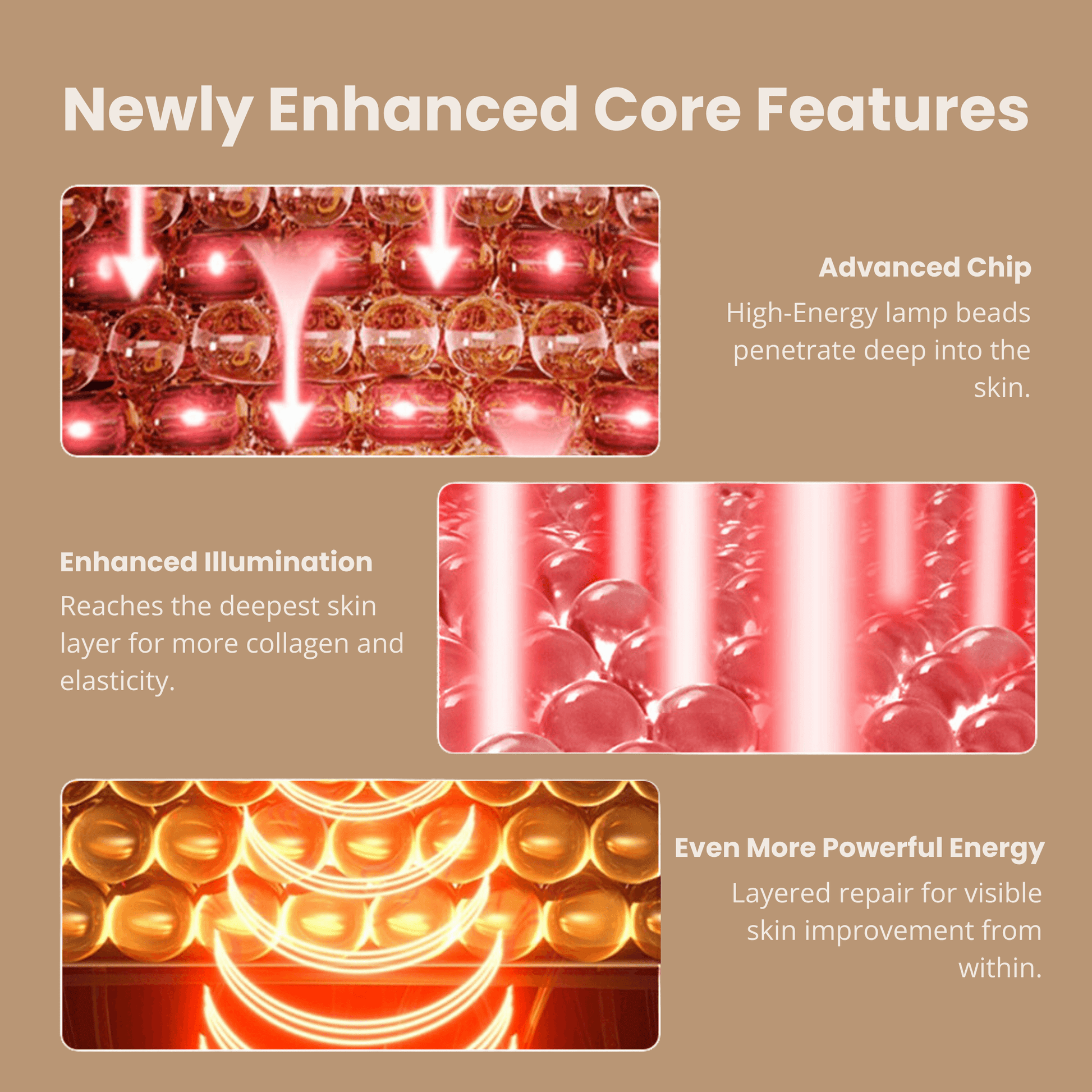 La luce infrarossa (830nm) agisce in profondità per favorire la rigenerazione della pelle, ridurre irritazioni e migliorare l’elasticità — per una pelle che non solo appare più giovane, ma lo è anche al tatto.