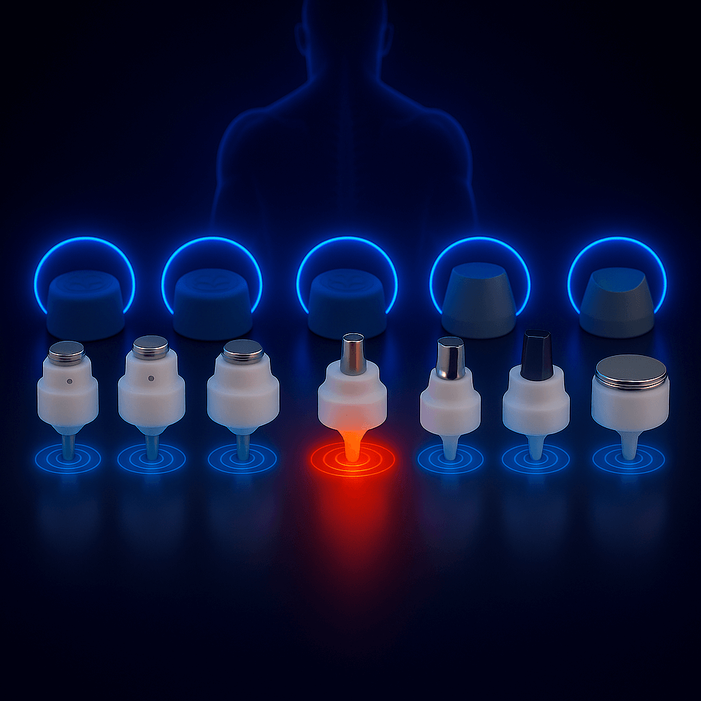 Seven interchangeable applicators direct energy precisely where it’s needed — from broad, superficial muscle areas to low-intensity ED protocols. With individually adjustable frequency and intensity, each session can be tailored for comfort, pace, and precision — delivering professional-level treatment without a clinic visit.