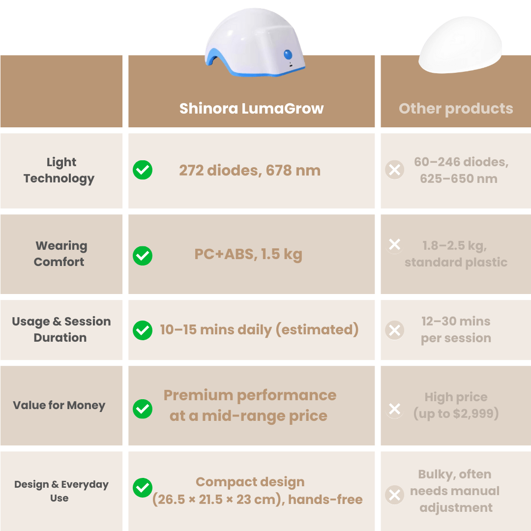 The LumaGrow Hair Growth Helmet gives you high-quality LED red light therapy with 272 diodes—at a fraction of the price of clinic visits or laser caps. Enjoy noticeable results from the comfort of your home, with no monthly fees or long-term commitments.
